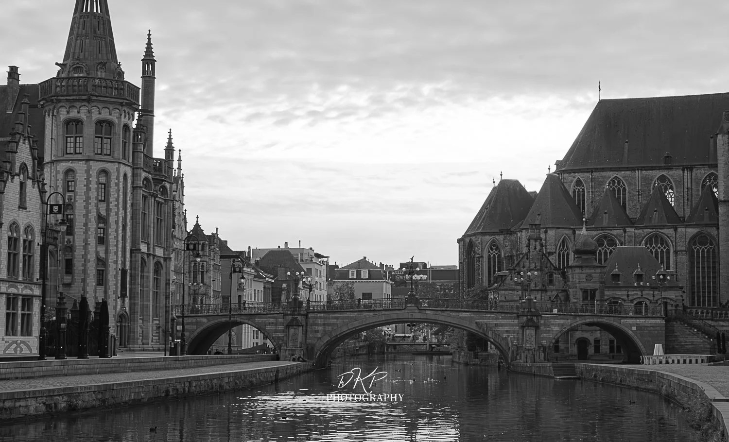 Black and white capture of the St. Michael Bridge while doing street photography in the beautiful Flemish city of Gent, Belgium.
